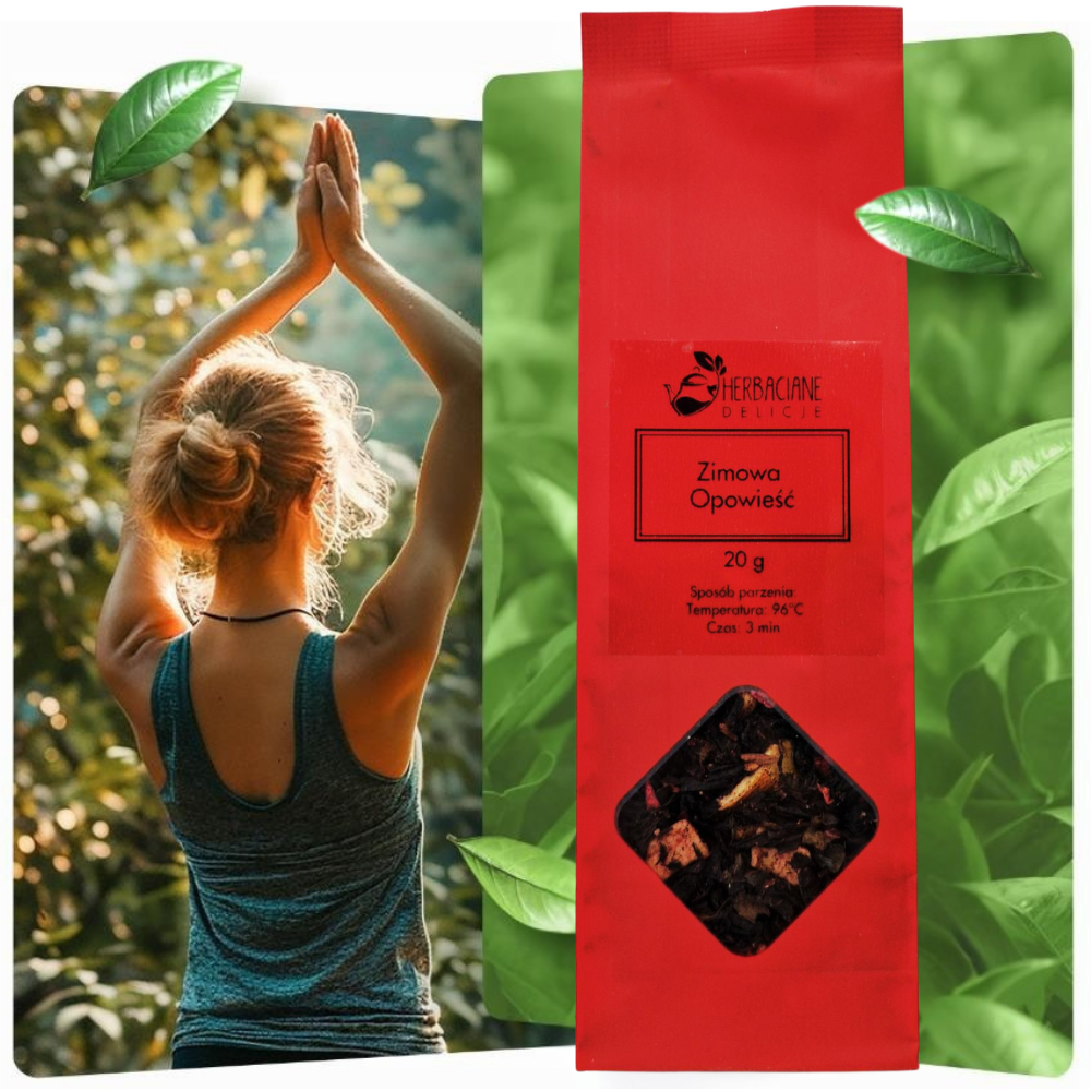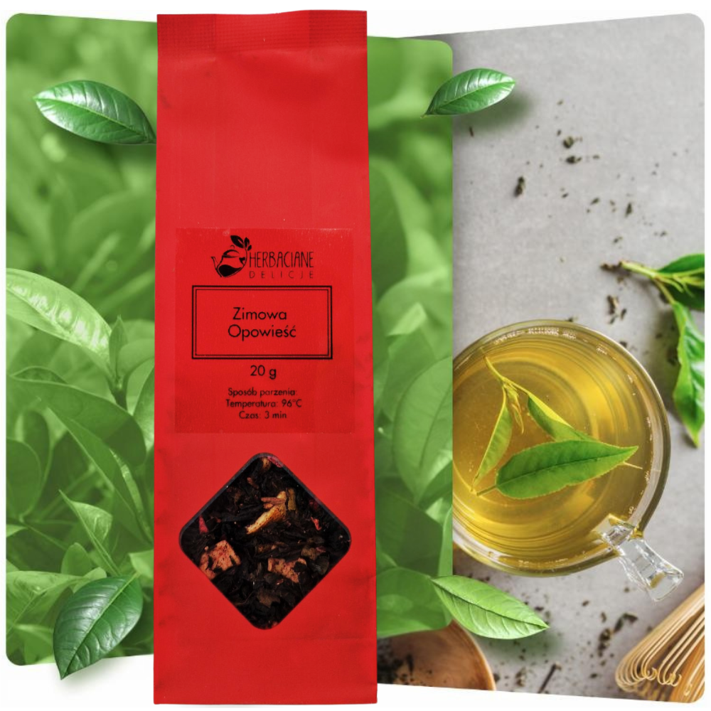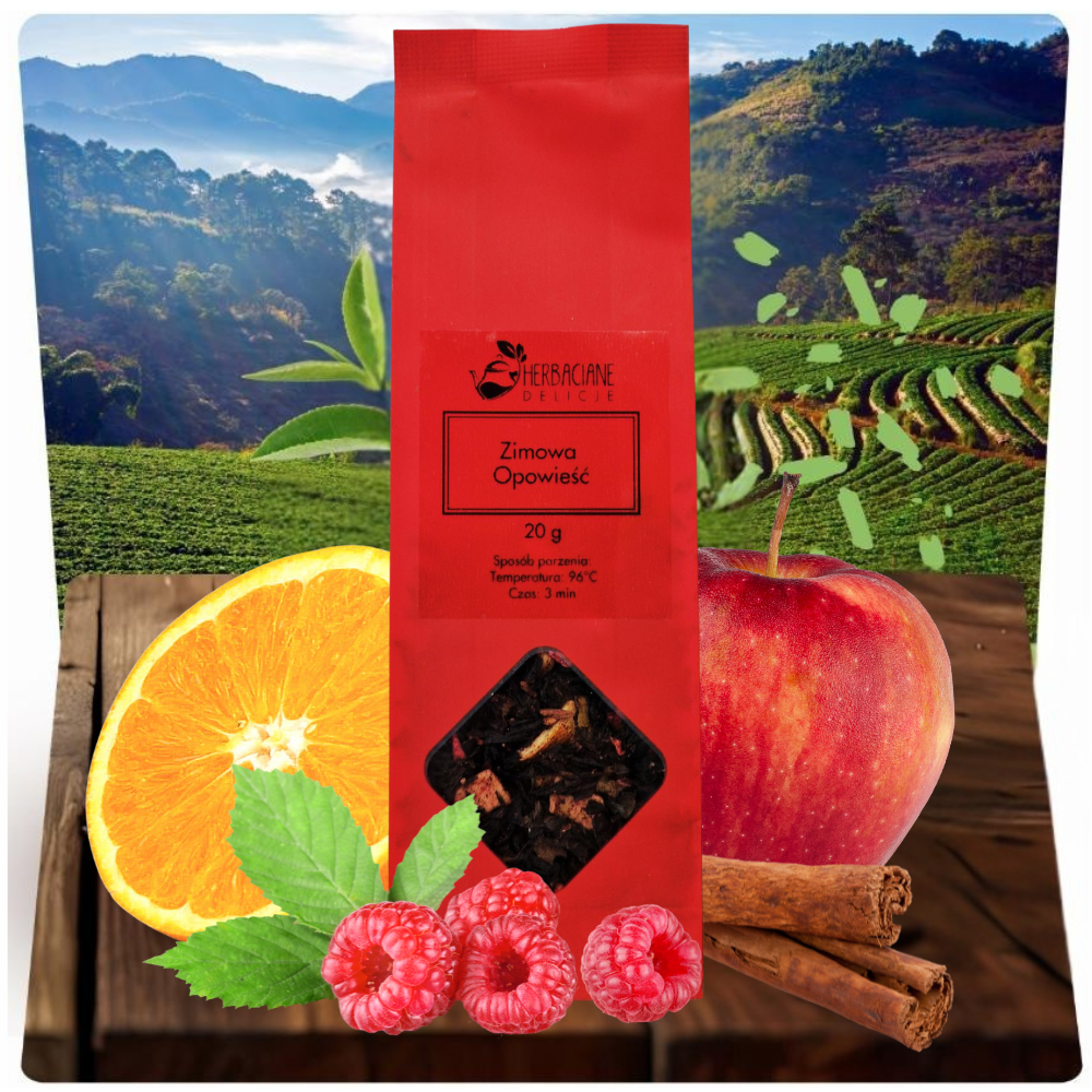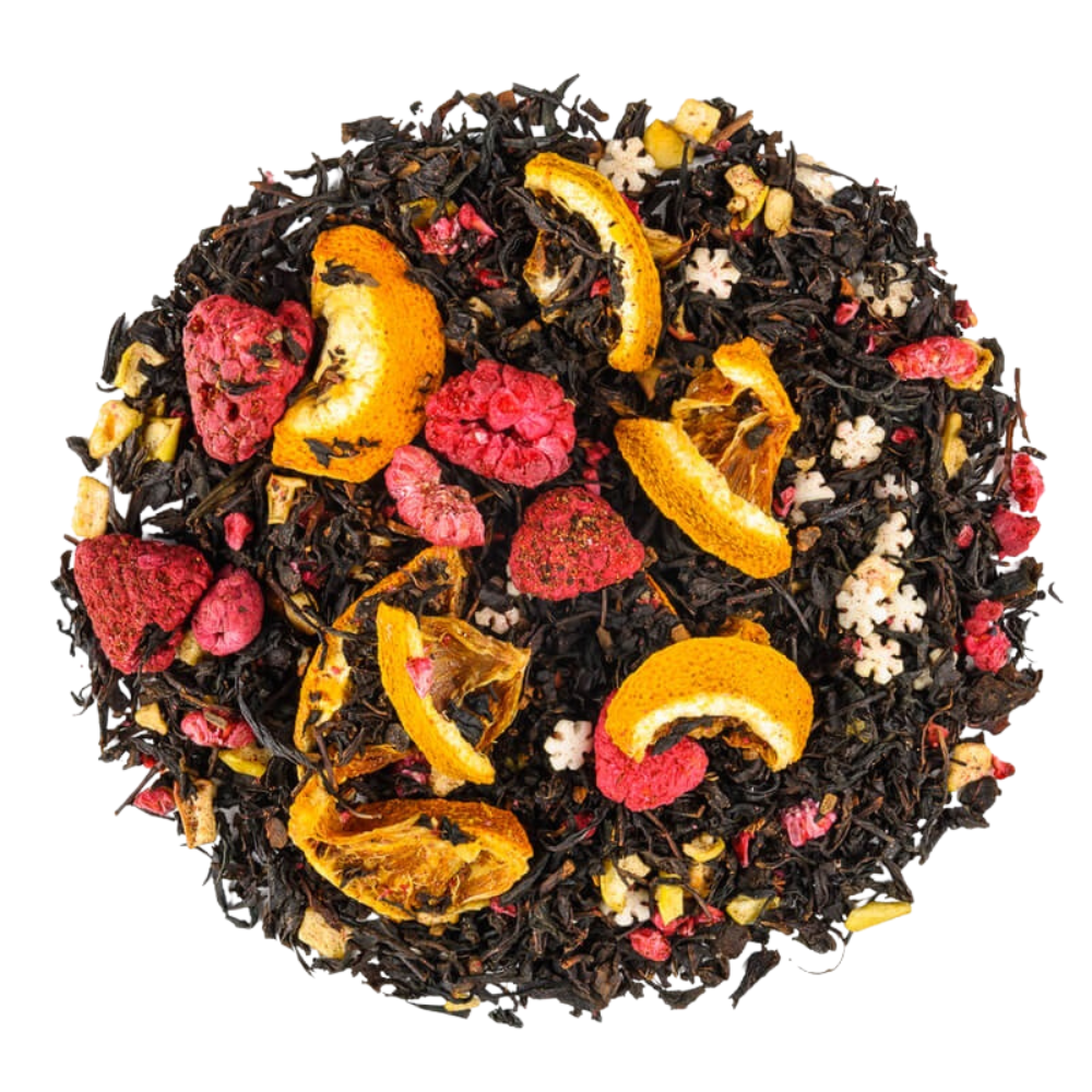 Rozgrzewająca i pełna uroku kompozycja, która przenosi w sam środek zimowej bajki. Głęboki smak czarnej herbaty łączy się z owocową słodyczą malin i jabłek, otulony aromatem soczystej pomarańczy. Cynamon dodaje korzennego ciepła, idealnego na chłodne dni, a cukrowe płatki śniegu nadają naparowi nutkę magii i subtelnej słodyczy.